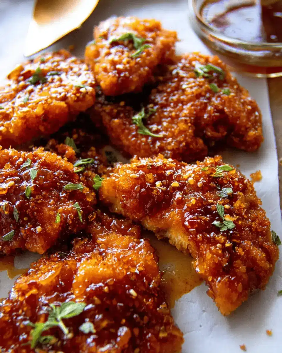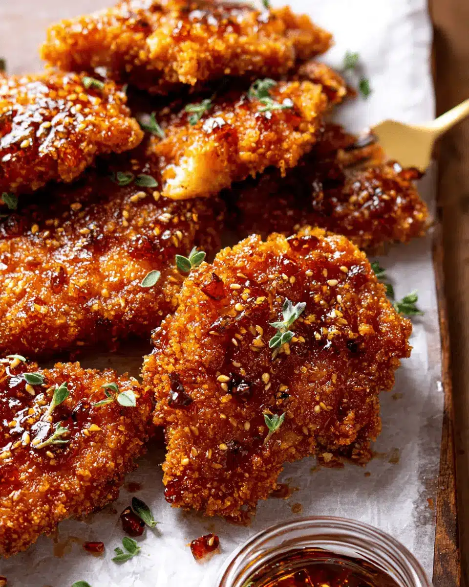 To get that irresistible crunch with your baked crunchy hot honey chicken, make sure to thoroughly coat each piece of chicken in your seasoned cornflake mixture. A double-dip method, where you dip the chicken in the egg mixture twice before rolling it in the crumbs, can really take the crunch factor to the next level. Also, don’t skimp on the olive oil drizzle before baking—this helps the chicken crisp up beautifully in the oven.