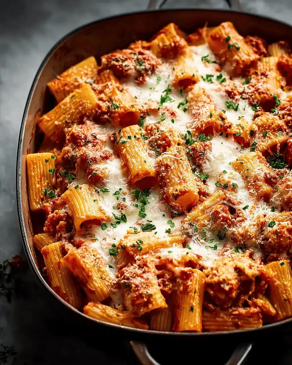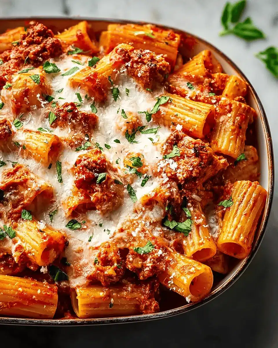 When serving baked rigatoni, consider a family-style presentation that invites everyone to gather around the table. Transfer the bubbling, cheesy dish directly from the oven to the center, and let your guests help themselves. Garnish with a sprinkle of fresh parsley to add a pop of color and a dash of flavor. To complement the meal, offer a side of garlic bread or a simple green salad dressed with olive oil and lemon. This invites a relaxed, communal atmosphere—perfect for a cozy evening with friends or family.