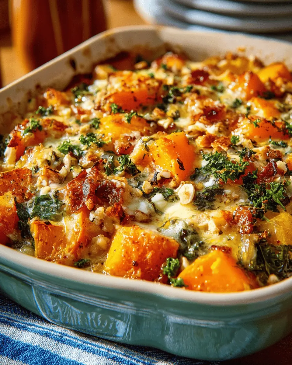 - Add the kale mixture and bacon to the butternut squash mixture in the baking dish. Gently mix together and spread into an even layer. Sprinkle with the cheese.