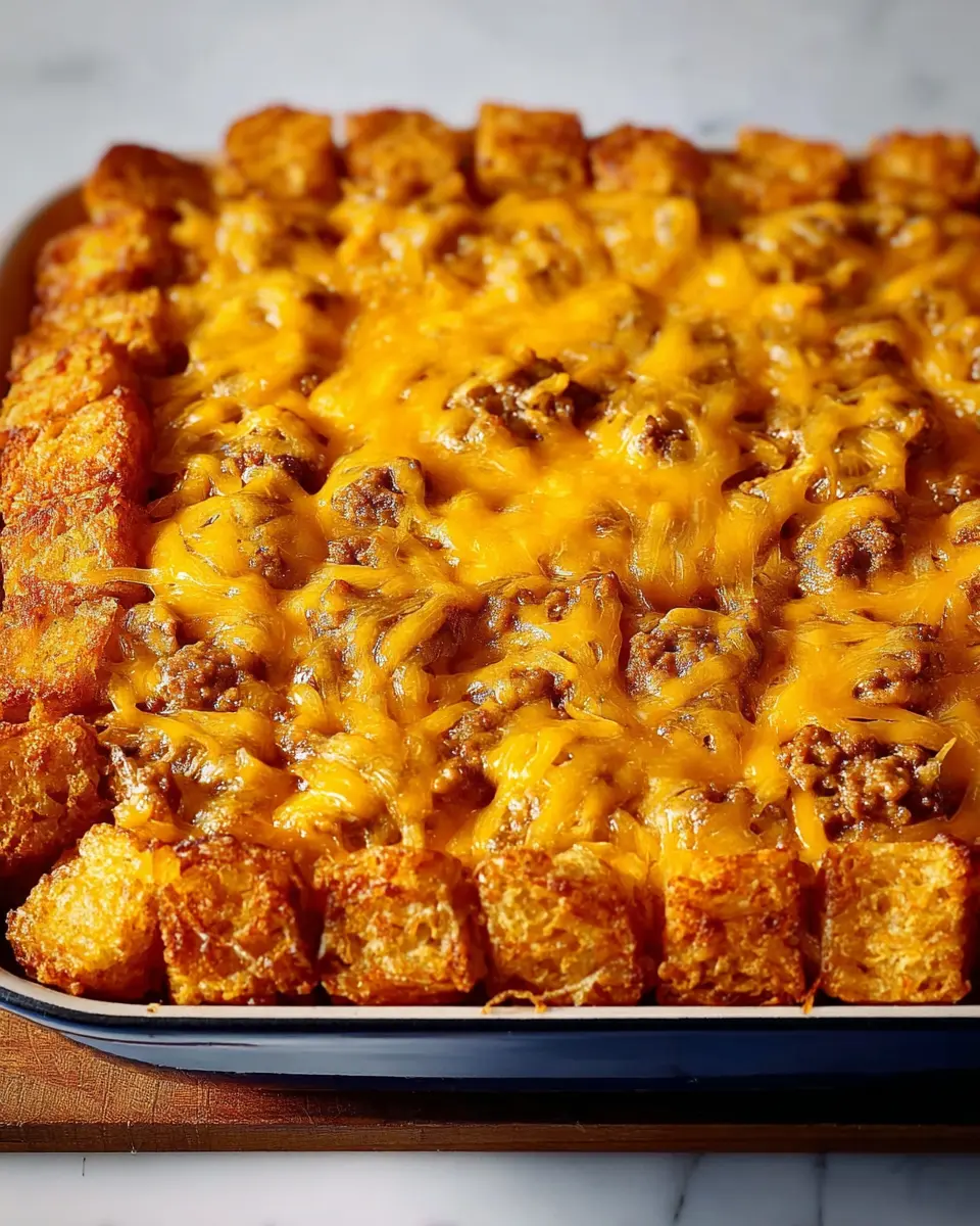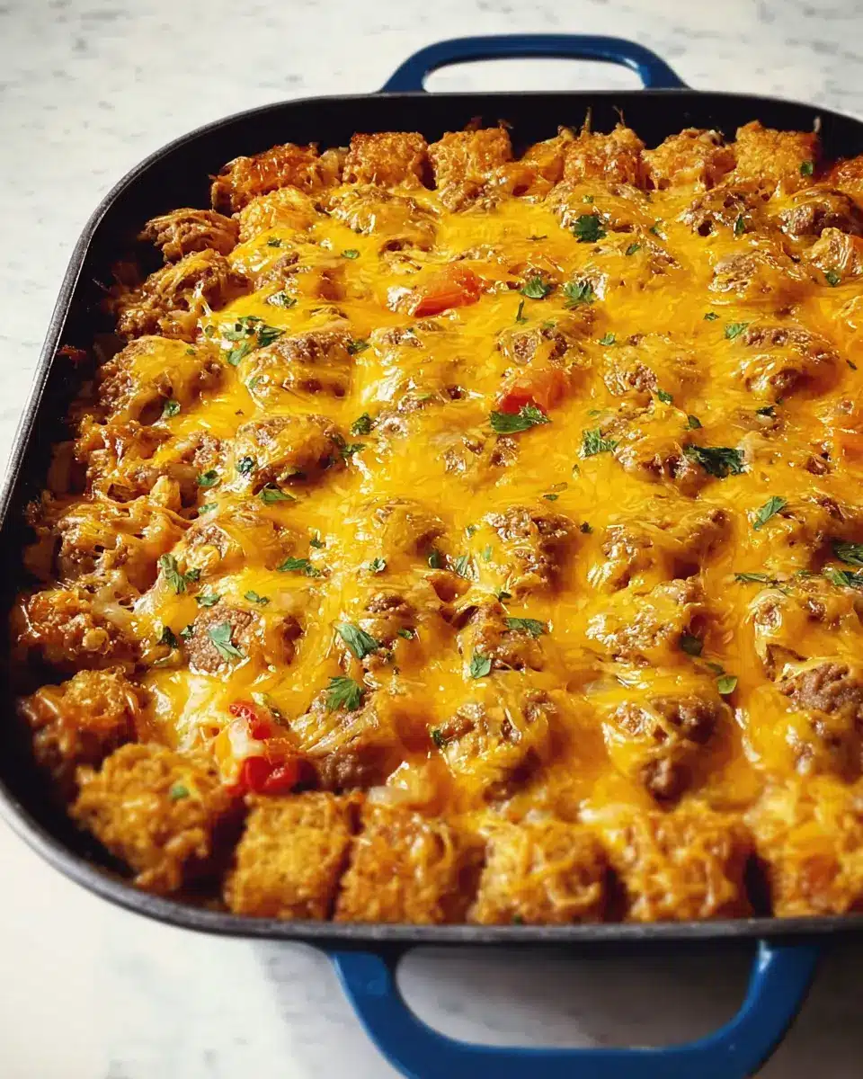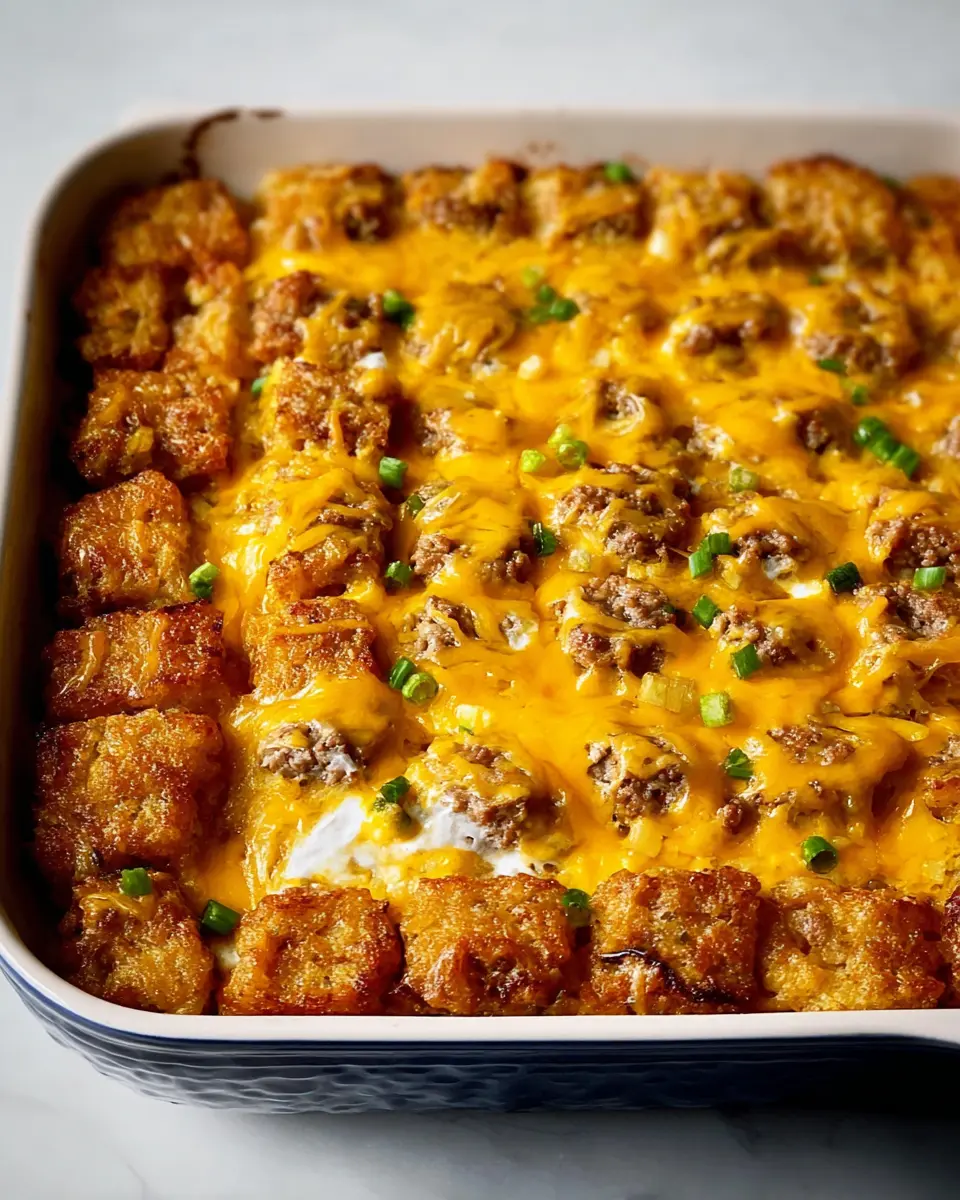Pop the dish into your preheated oven and let it bake for about 45 minutes. You want the Tater Tots to be golden and crispy, with cheese bubbling up from underneath. The result is pure comfort food bliss!