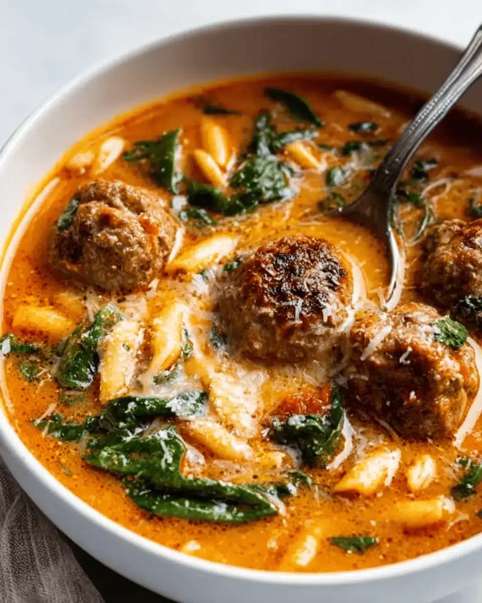 This Creamy Italian Meatball Soup Recipe is hearty enough to stand alone, but it shines even brighter when paired with a warm, crusty bread. A slice of rustic sourdough or garlic bread can perfectly complement the rich flavors of the soup. For a lighter option, consider serving a vibrant mixed green salad on the side, drizzled with balsamic vinaigrette. It adds a refreshing crunch and balances the creaminess of the soup beautifully.