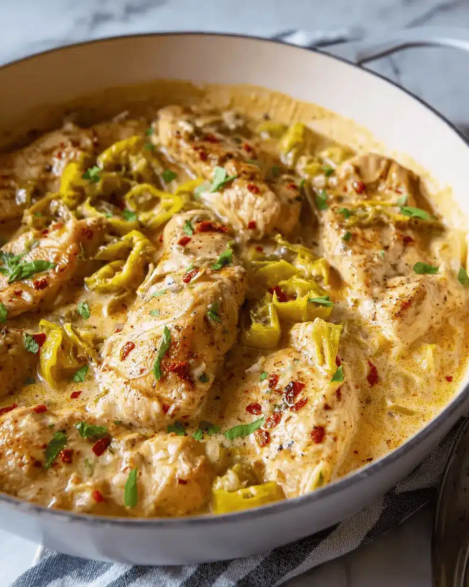 Presentation is key! Serve the creamy pepperoncini chicken in a colorful cast-iron skillet for a rustic touch. Garnish with freshly chopped parsley for a burst of color and a sprinkle of crushed red pepper for an extra kick. Pair each serving with artisan bread for dipping into that savory sauce — it’s sure to steal the spotlight! For more creativity, consider using individual ramekins and layering the chicken with the creamy sauce for a fun, personal touch. You'll wow your guests every time!