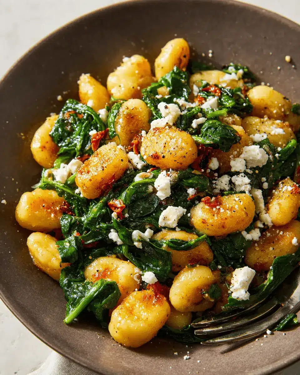 In conclusion, crispy gnocchi with spinach and feta is a delightful dish that effortlessly combines flavors and textures. Perfect for a quick dinner or a casual gathering, it’s both nutritious and satisfying. Try this recipe to impress your friends and elevate your weeknight meals! Enjoy every bite!
