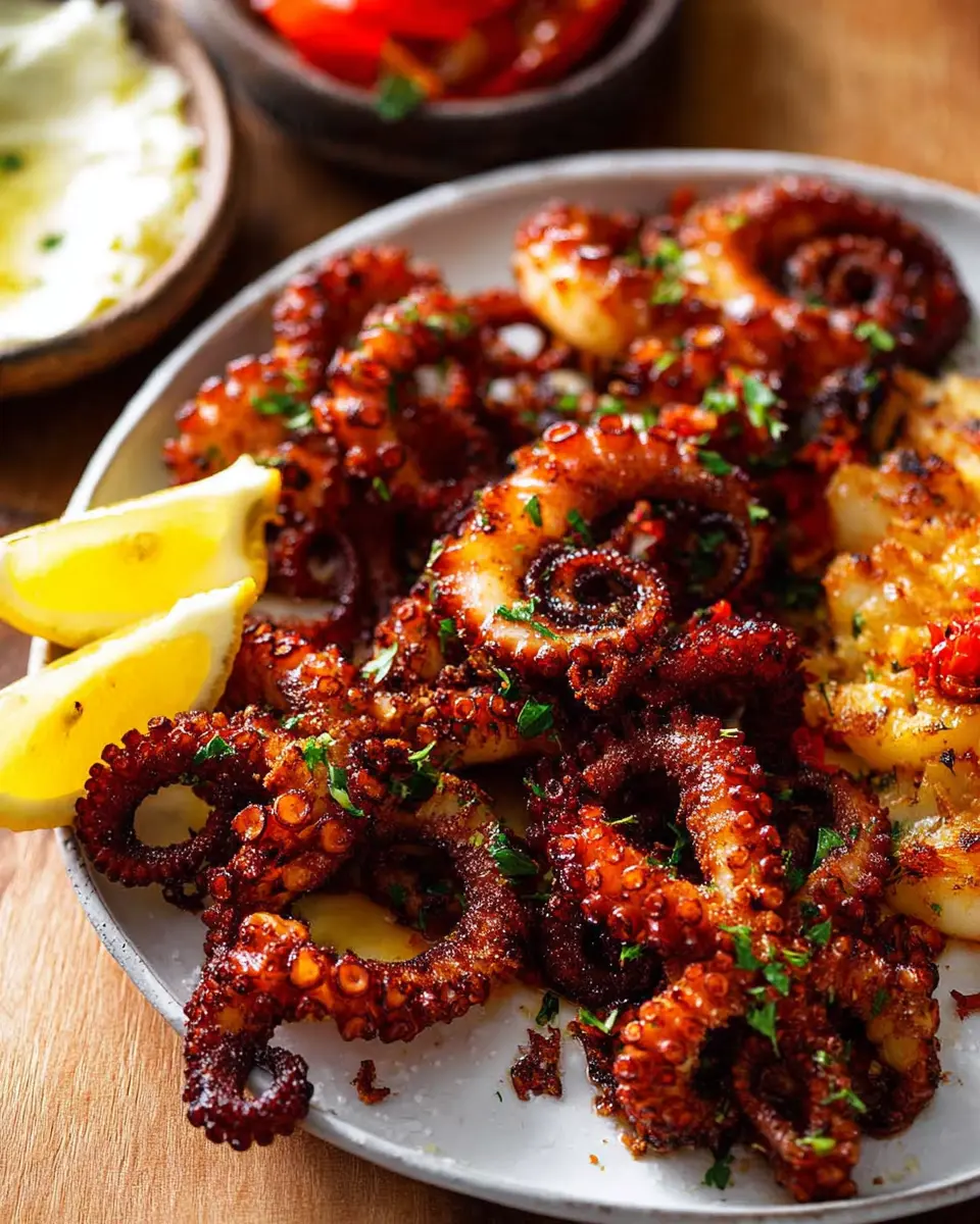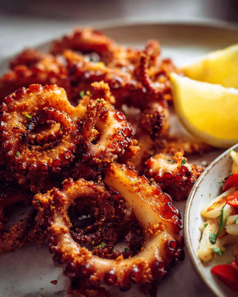 Serve your crispy marinated baby octopus on a platter, topped with finely chopped parsley and sliced chili. Add some lemon wedges for an extra burst of freshness. Enjoy it with some crusty bread for a true Mediterranean feast!