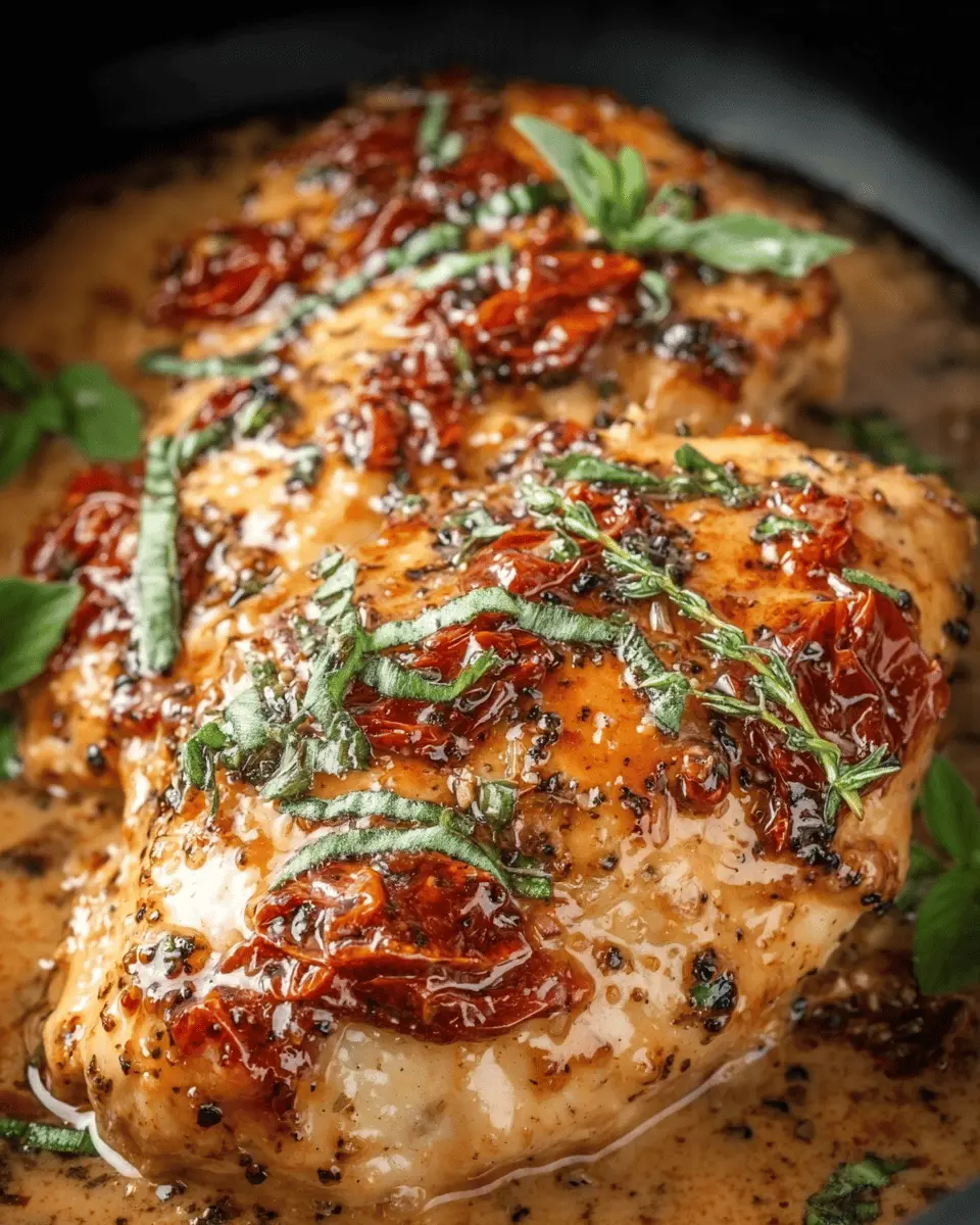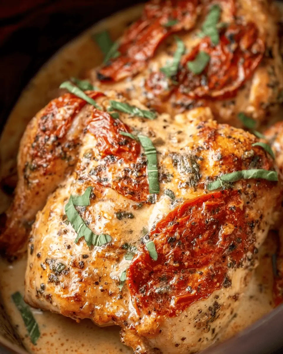 - Top each chicken breast with the chopped sun-dried tomatoes. Cover and cook on low for 3-4 hours or on high for 1.5-2 hours, until chicken reaches 165°F (74°C).