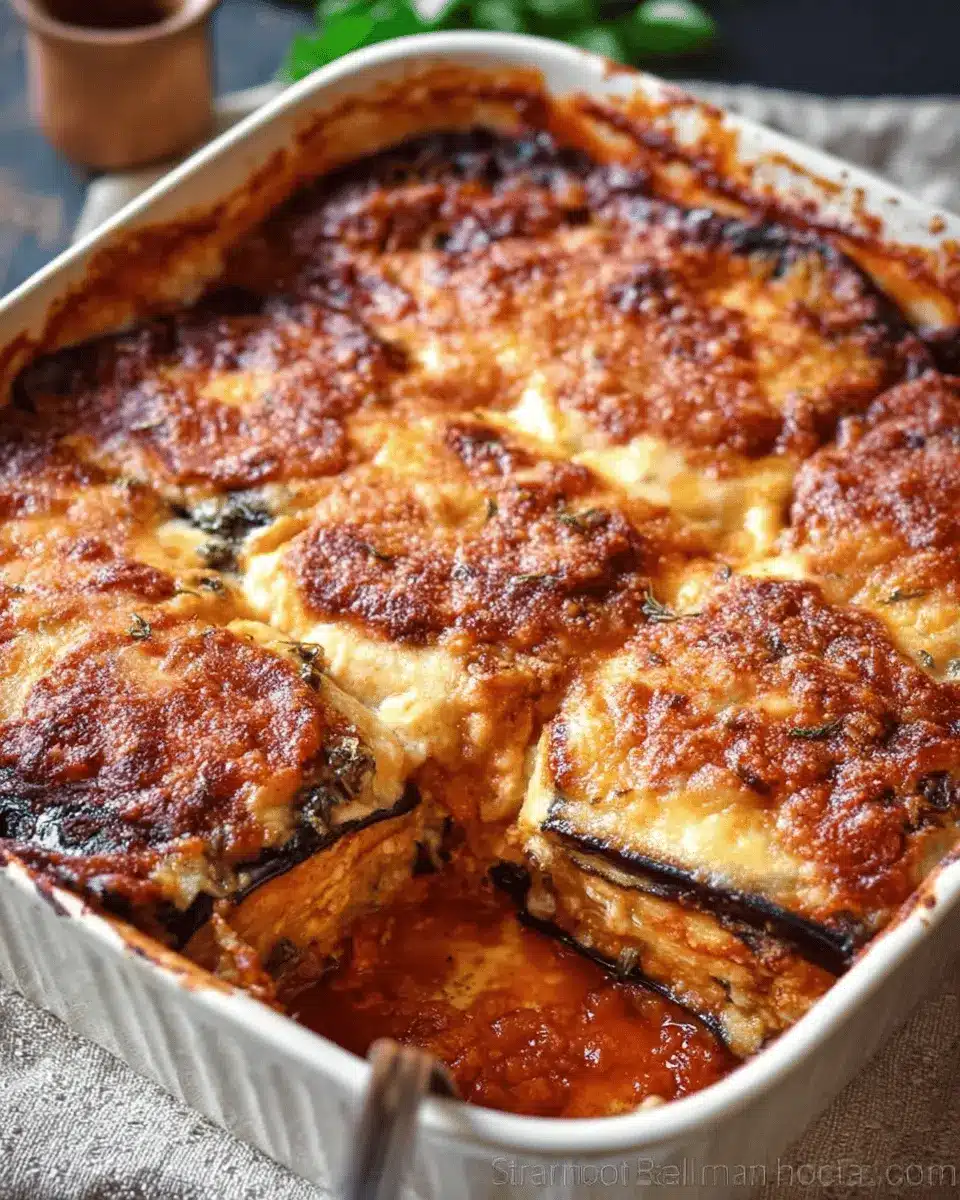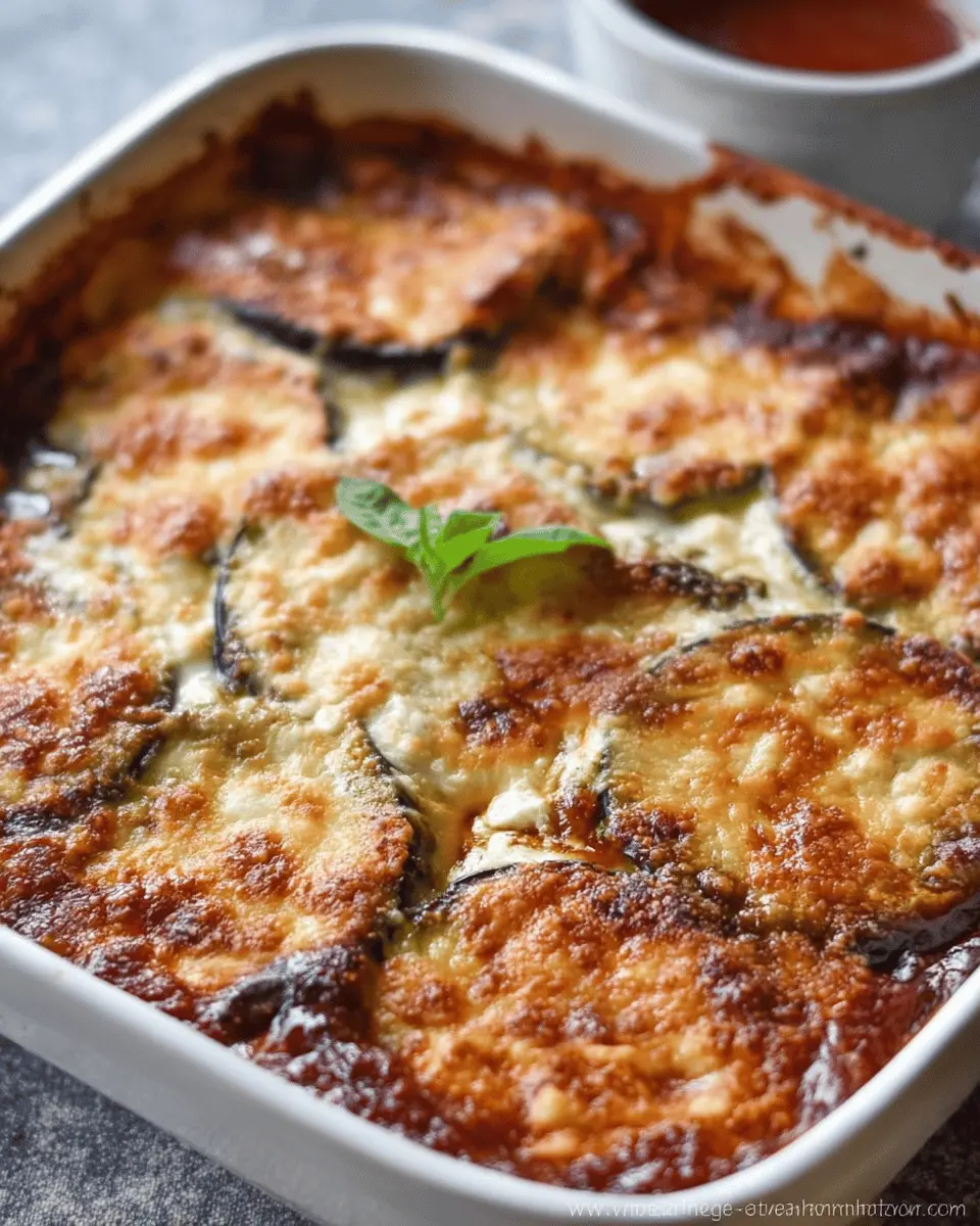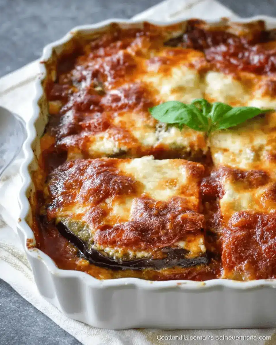 Grab a 9x13 inch baking dish and start layering! Begin with a layer of eggplant, followed by a layer of your flavorful tomato sauce, and then the ricotta mixture. Repeat the process—more eggplant, more sauce, and finish off with the ricotta mixture. Don’t forget to sprinkle the remaining half cup of parmesan on top for a beautifully golden crust.