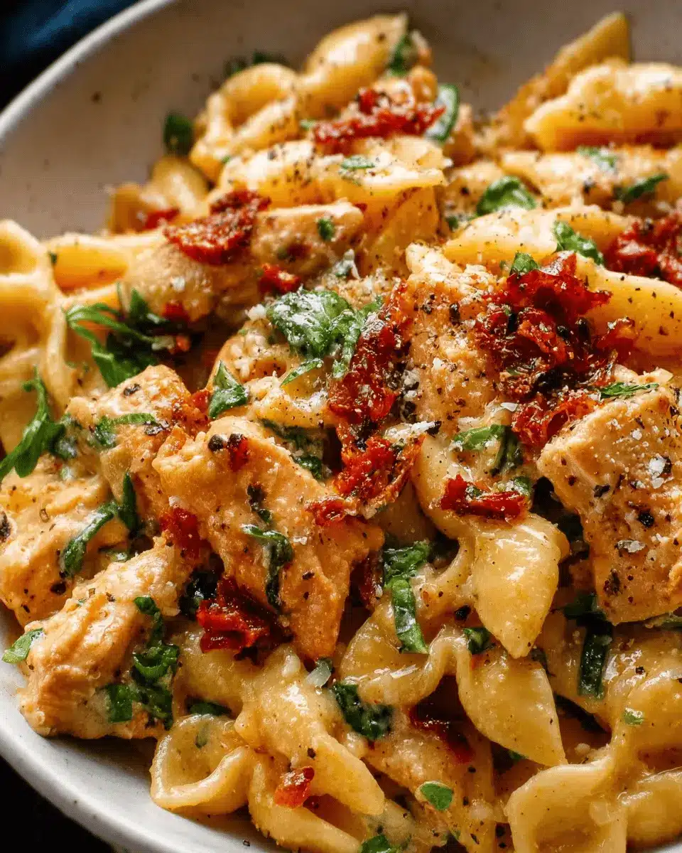 Now, let’s get to the good part—creating the sauce! In that same skillet, melt 3 tablespoons of butter over medium heat. Once melted, add 2 teaspoons of minced garlic and sauté for about 30 seconds until fragrant. Sprinkle in 3 tablespoons of flour, stirring to create a roux. Gradually whisk in 2 cups of chicken broth, 1 cup of heavy cream, and 1 cup of grated parmesan cheese. Add 1 cup of drained sun-dried tomatoes, 1 teaspoon of paprika, and 2 teaspoons of dried Italian seasoning, stirring well. Allow this luscious mixture to simmer for a few minutes to thicken up beautifully.