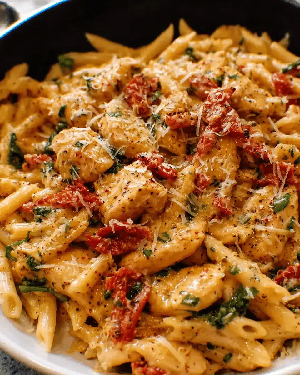 It’s time to bring everything together! Carefully return the cooked chicken to the skillet with the sauce, followed by the penne pasta. Toss everything together until each piece of chicken and pasta is coated in that creamy goodness. Give it a taste, and feel free to adjust the seasoning with a little extra salt or pepper if necessary.