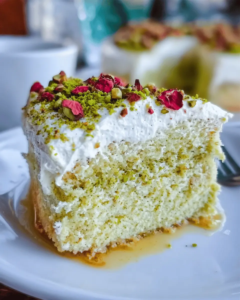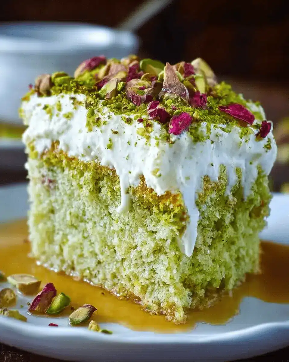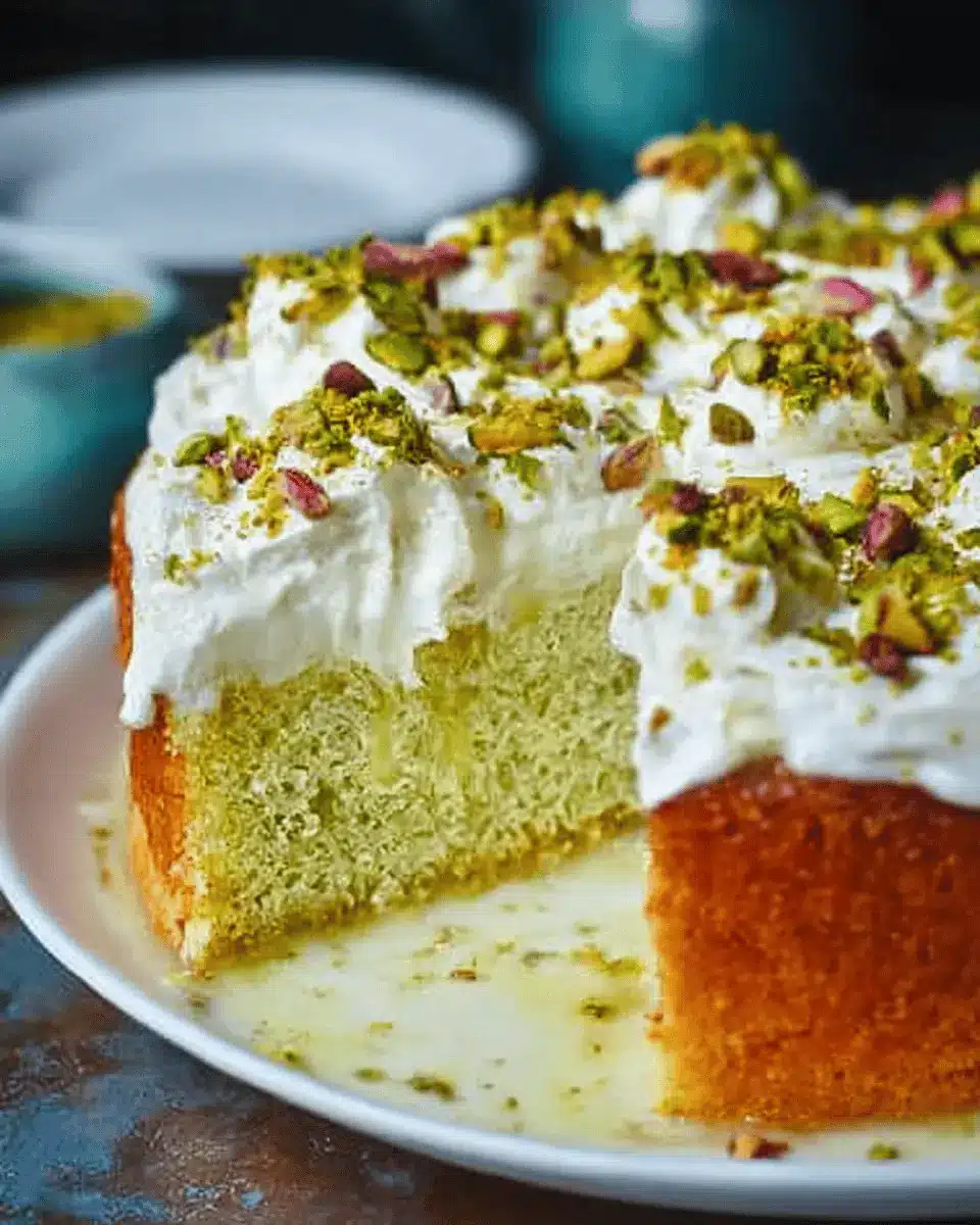 These ingredients come together beautifully, delivering a soft, moist cake infused with the vibrancy of pistachios and cardamom.