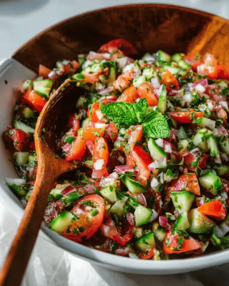 Absolutely! Shirazi Salad is perfect for meal prep. You can chop the vegetables and mix them with the dressing up to a day in advance. Just be sure to hold off on adding fresh mint until you’re ready to serve, as it will keep its vibrant flavor and color longer that way!