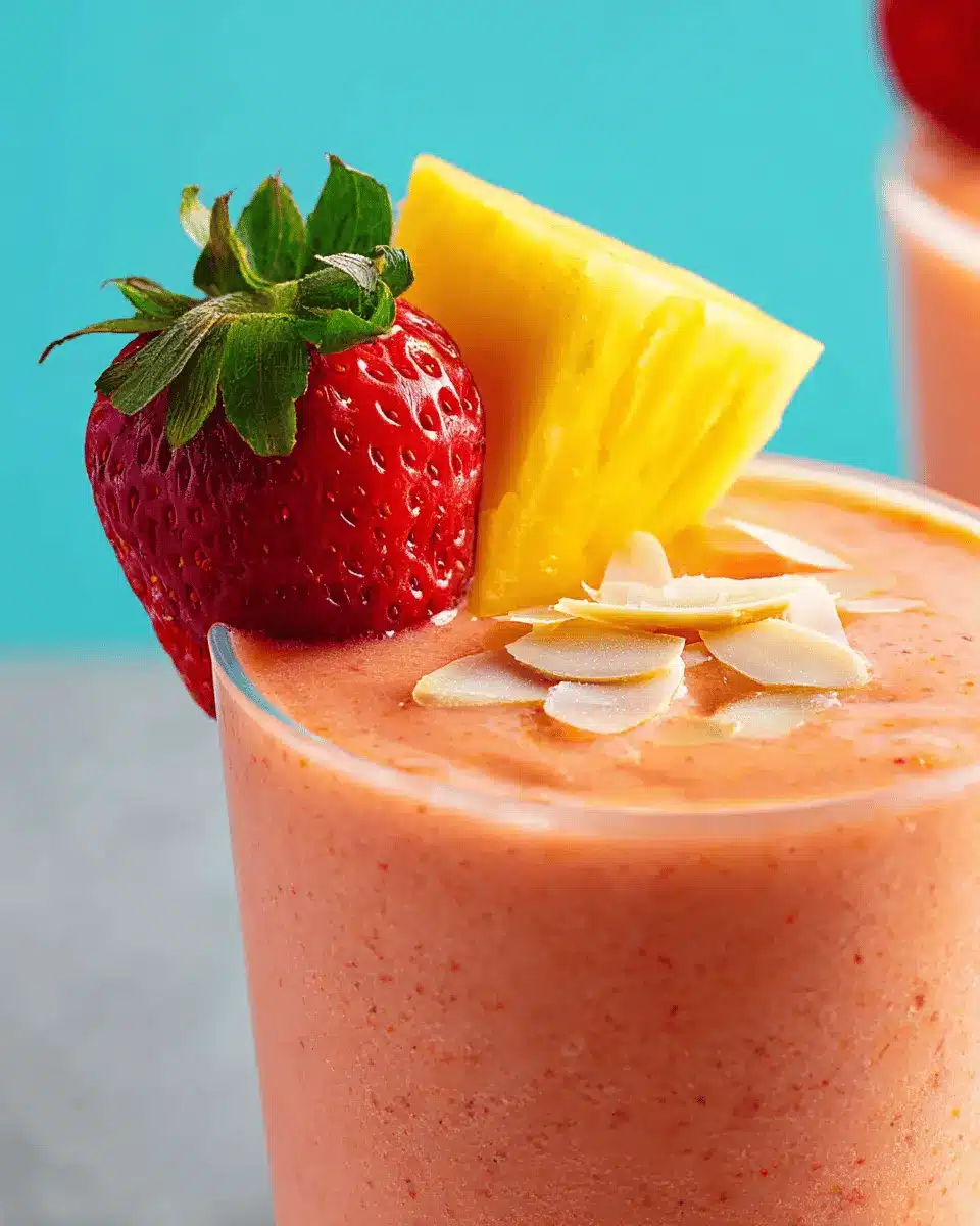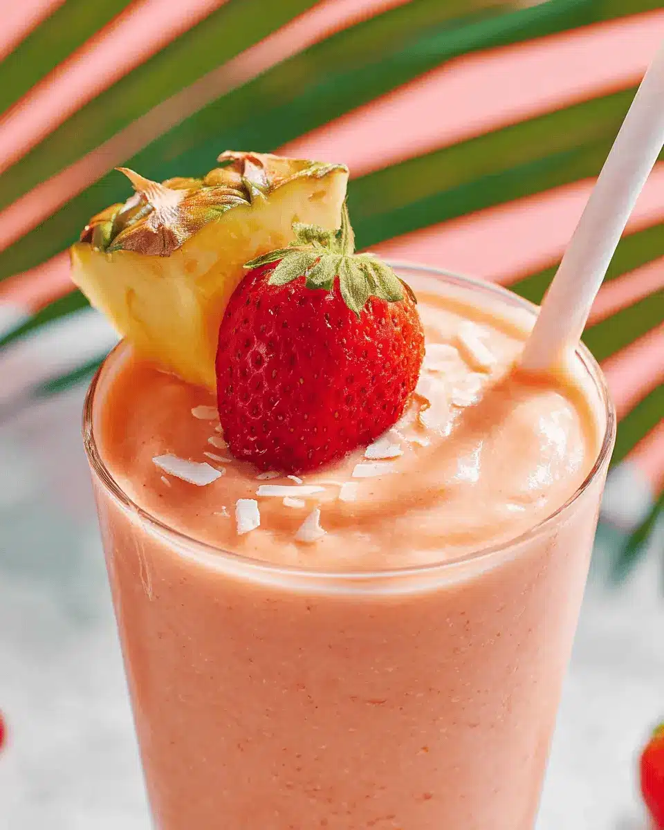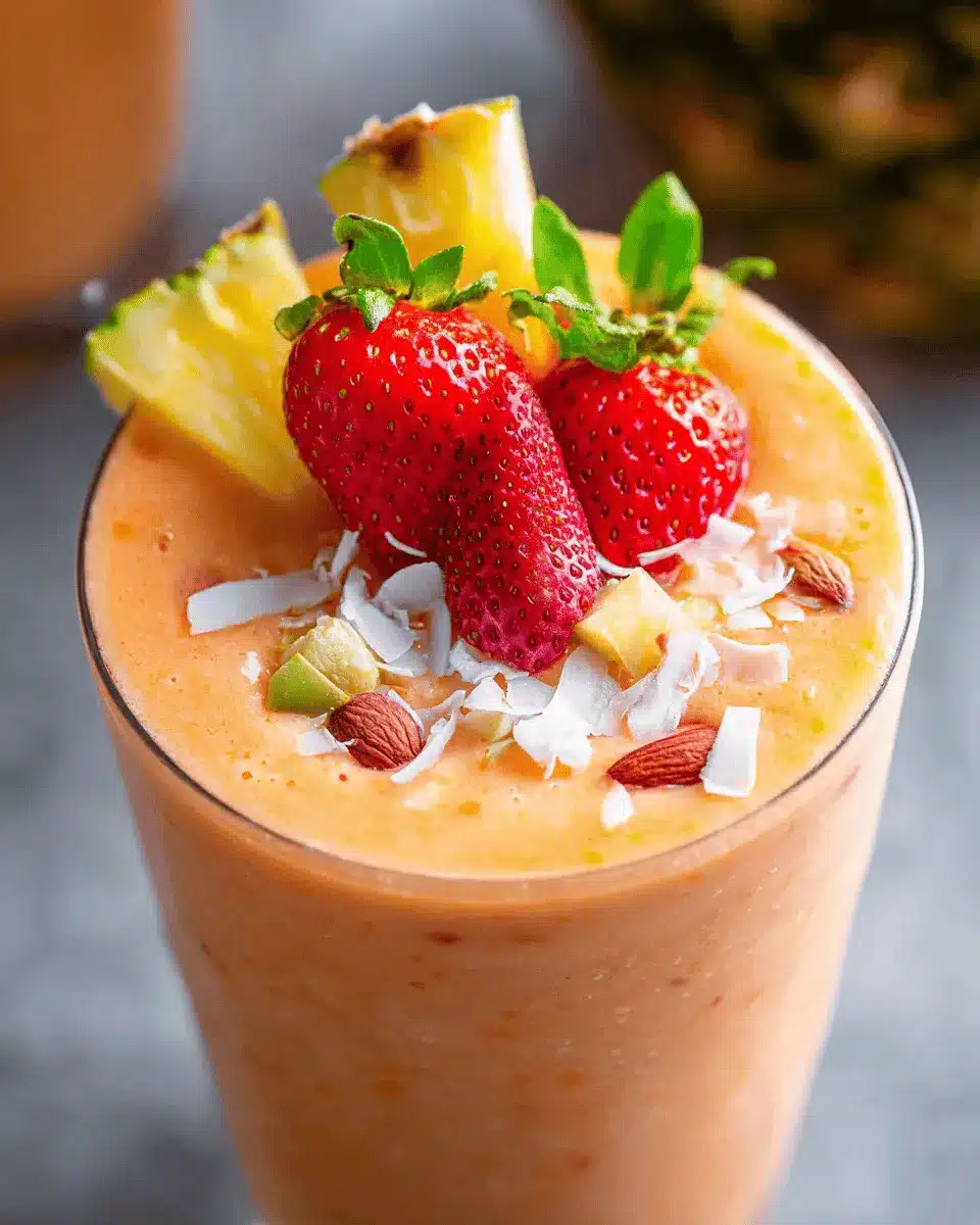 Pair your tropical smoothie with crunchy snacks like mixed nuts, coconut chips, or chia seed energy bites. For a more indulgent touch, serve with a slice of coconut macaroons or a light fruit salad on the side. If you’re looking for something savory, lightly toasted pita chips with hummus can provide a delightful contrast to the smoothie’s sweetness. For additional nutritional benefits, sprinkle a tablespoon of flaxseeds or hemp hearts on top before serving.