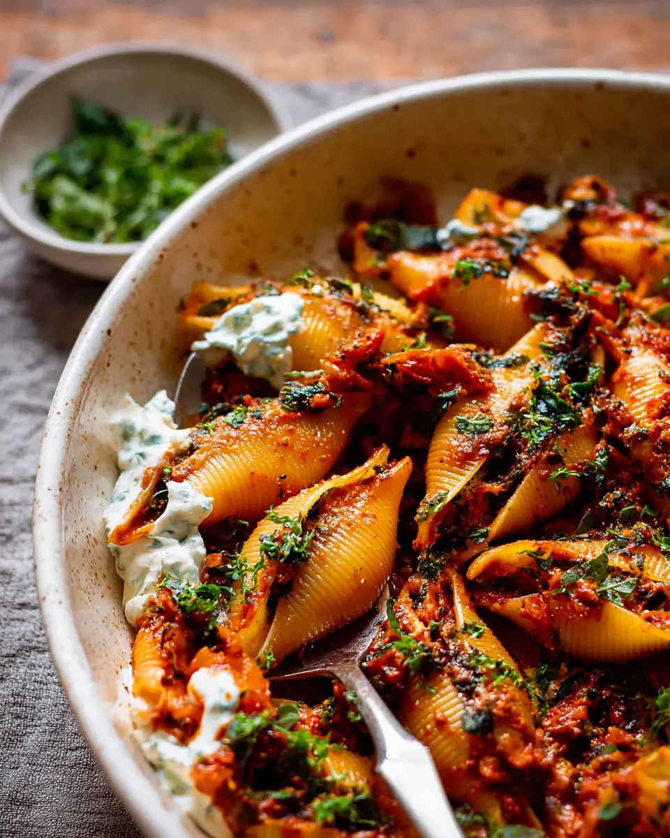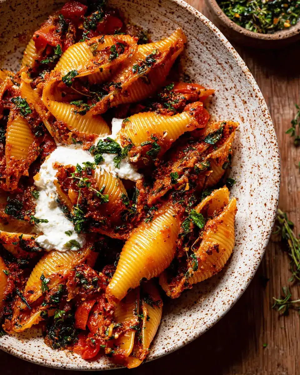 Unstuffed Spicy Tomato Basil Shells with Whipped Ricotta.