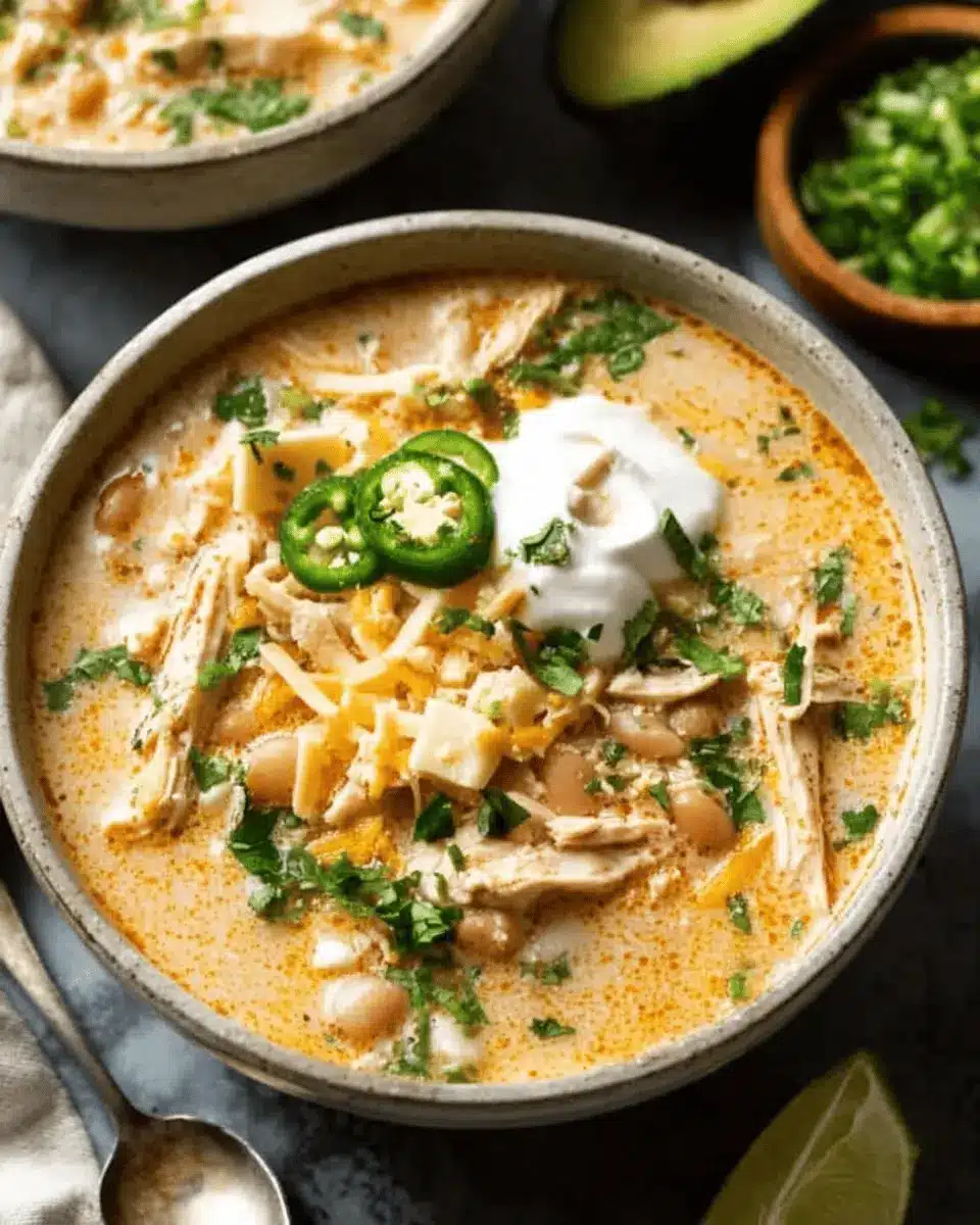 Remove the pot from the heat and stir in the sour cream or plain Greek yogurt to get that luscious, creamy texture we love in a white chicken chili. Taste and adjust the seasoning if needed. Serve hot, garnished with your favorite toppings—think fresh cilantro, shredded cheese, or crunchy tortilla chips for that extra flair!